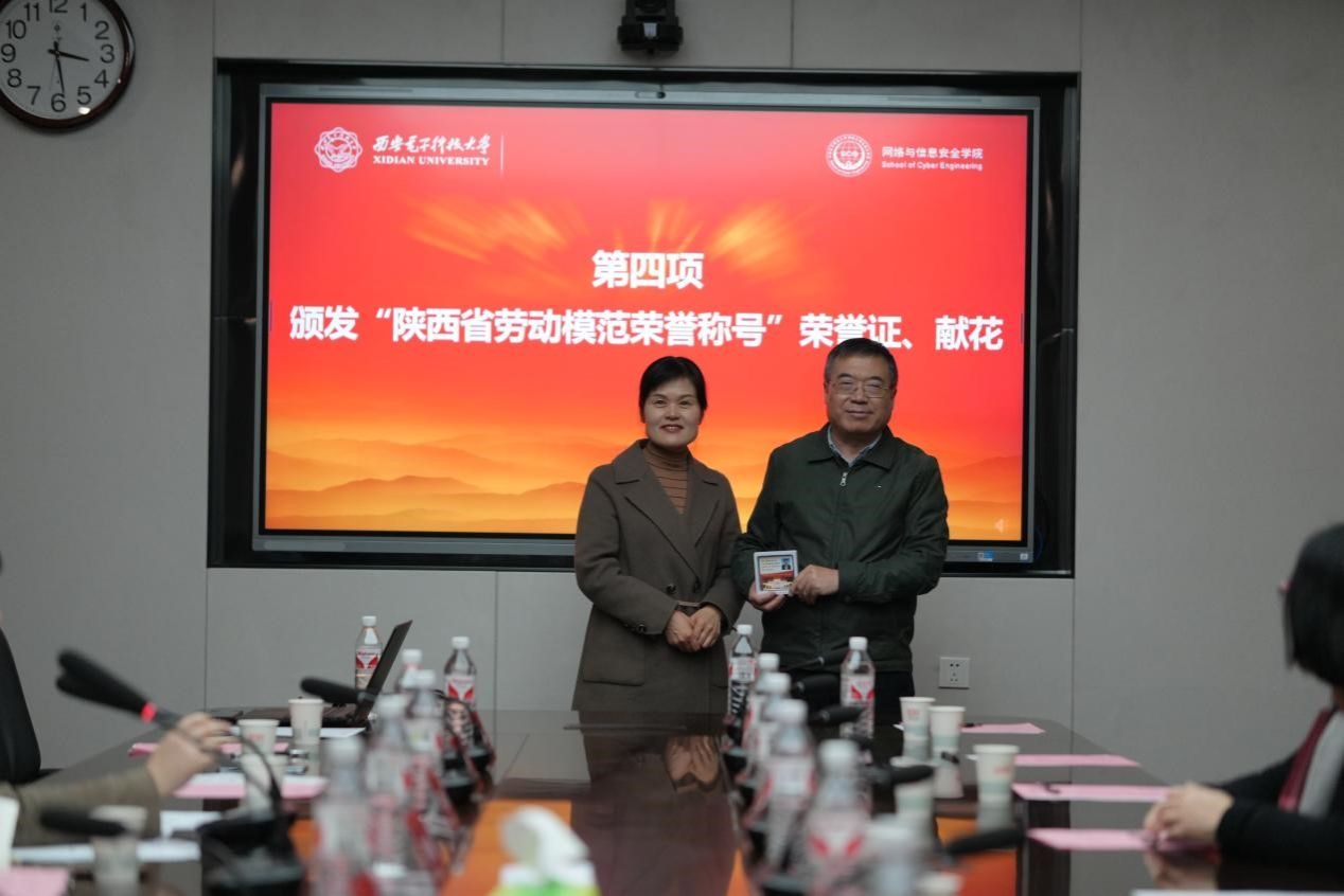 工会常务副主席吴秀霞为马建峰教授颁发“陕西省劳动模范荣誉称号”荣誉证书,员工代表郭晶晶上台献花。