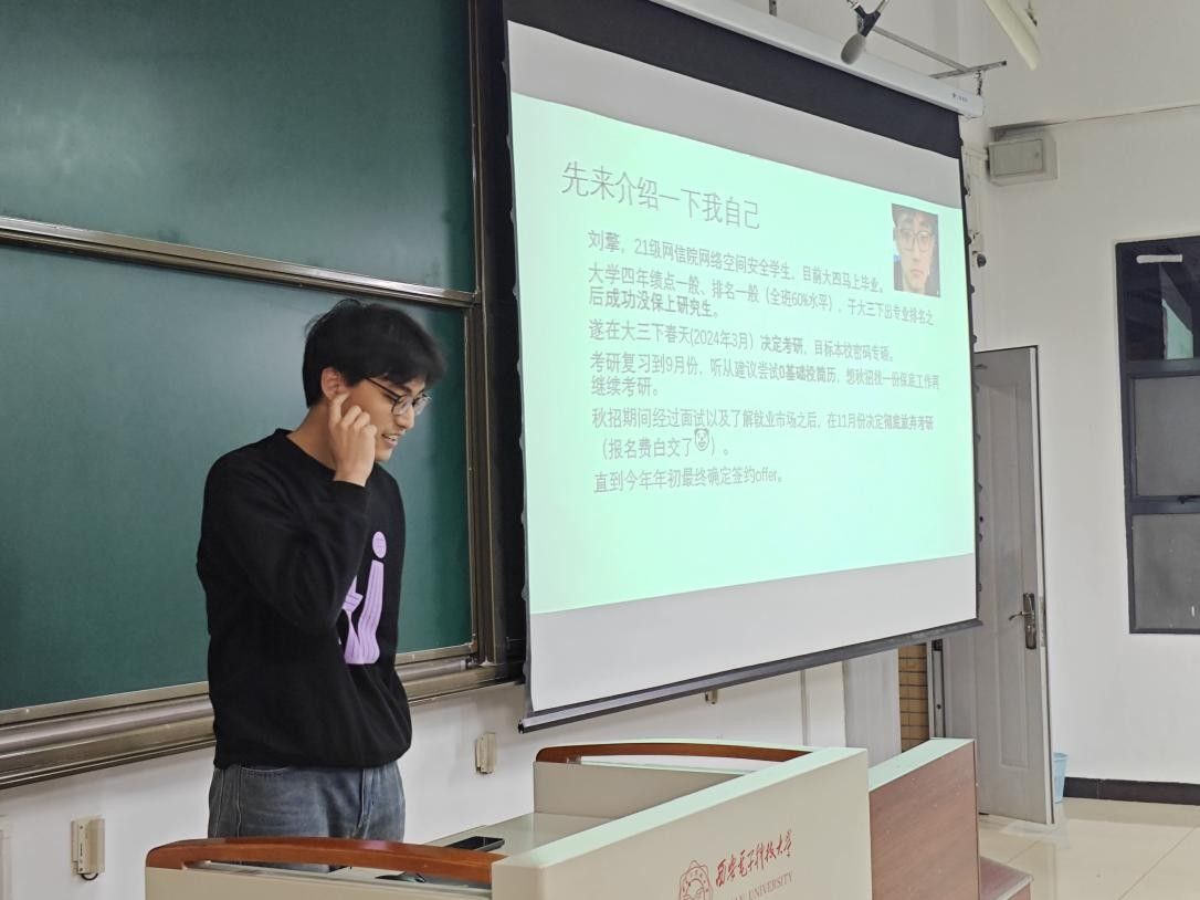 首先登台的是刘擎学长,他分享了自己的求职心路历程。刘学长在备战考研期间转向了职场,尽管错过了秋季招聘的黄金时期,但他凭借精心的准备,最终成功收获了TP-LINK和华为的录用通知书。刘学长强调,求职之路未必如想象中险峻,只要准备充分,找到一份令人满意的工作并非遥不可及。他以自己的经历为鉴,鼓励同学们积极备战,卸下心理负担,相信在以后秋招的黄金季节,大家定能收获满满。随后,刘学长通过精心制作的PPT,详尽地对比了考研与求职的时间线,为那些在考研与求职之间犹豫不决的同学指明了方向。他最后提醒,简历的准备至关重要,至少应投入一周的时间进行修改和完善,两周时间则更为理想。