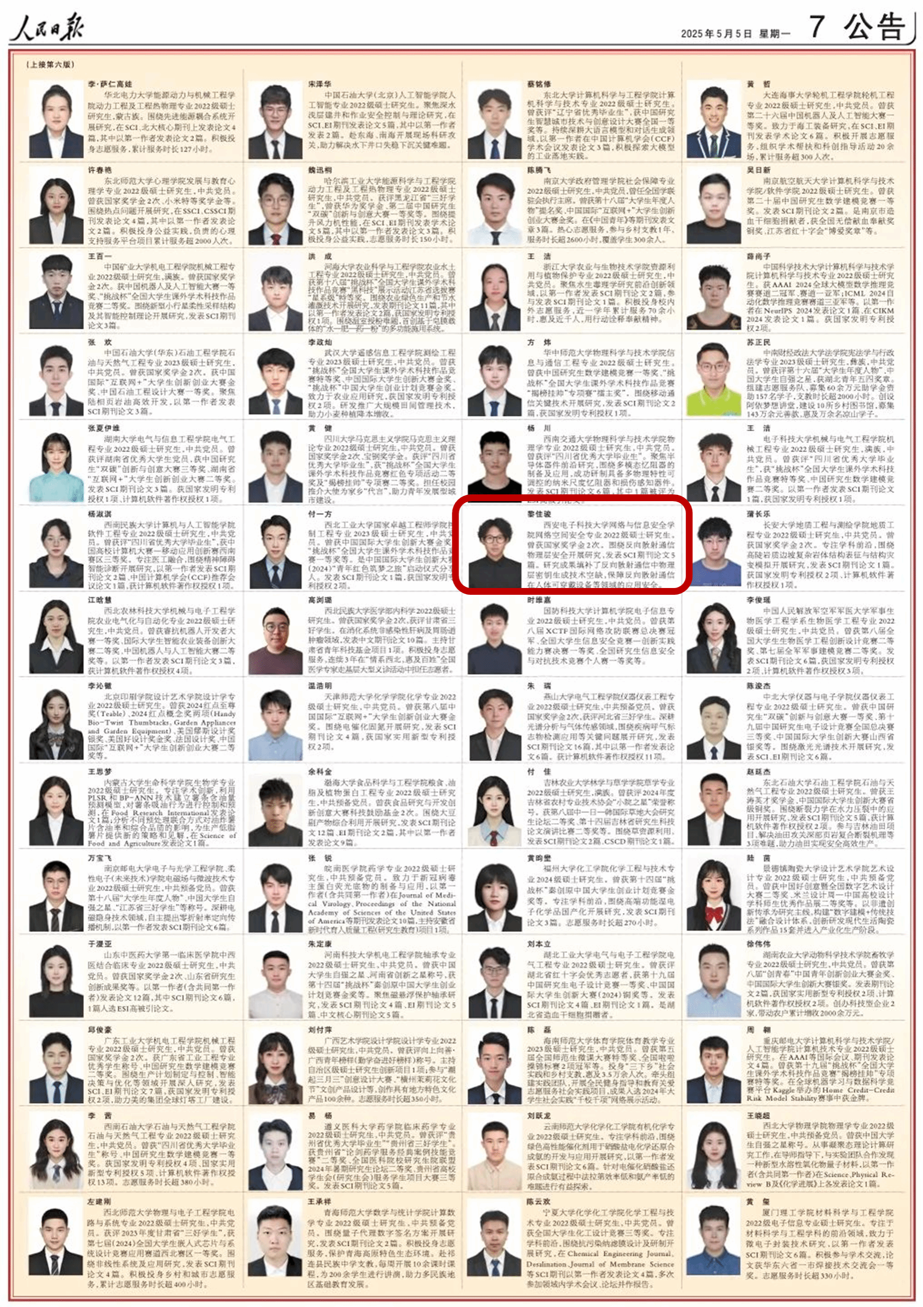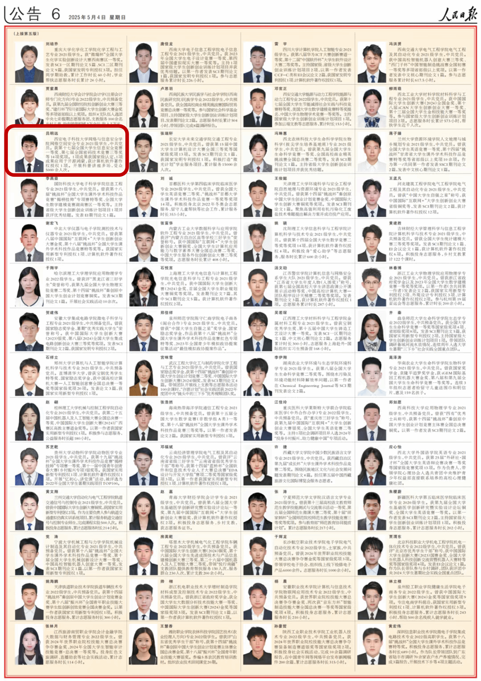 (通讯员 王慧洁)2025年5月4日,《人民日报》专版刊登《2023-2024学年度本专科生国家奖学金获奖员工代表名录》《2024年研究生国家奖学金获奖员工代表名录》,遴选出全国本专科生国家奖学金和研究生国家奖学金获奖员工代表各100名。william威廉英国官网网络空间安全专业2021级本科生吕明远、网络空间安全专业2022级硕士研究生黎佳骏分别从12万名本专科生候选人和9万名研究生候选人中脱颖而出,双双入选!