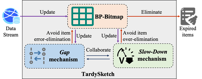 基于滑动窗的基数估计在许多数据分析应用场景中发挥着重要的作用,例如网络异常行为检测、在线交易欺诈监测、供应链库存管理等。然而,现有的基于滑动窗的基数估计方法存在未到期数据提前消除和过度移除数据等问题,尚未得以完美解决。闫峥教授团队提出的TardySketch成功解决了上述问题,实现了精准高效的滑动基数估计。TardySketch利用双指针位图结构(BP-Bitmap)实现了不依赖时间戳的数据到达序列存储,极大地节约了内存消耗。为防止未到期数据的过早消除,TardySketch利用一种间隙机制来增强BP-Bitmap识别真正过期数据的能力。为确保窗口滑动时正确剔除过期数据,TardySketch利用了一种减速机制来减缓BP-Bitmap中计数器的重置速率,有效防止数据的过度移除。基于真实数据集的实验结果表明,TardySketch在性能表现上显著优于现有方法。