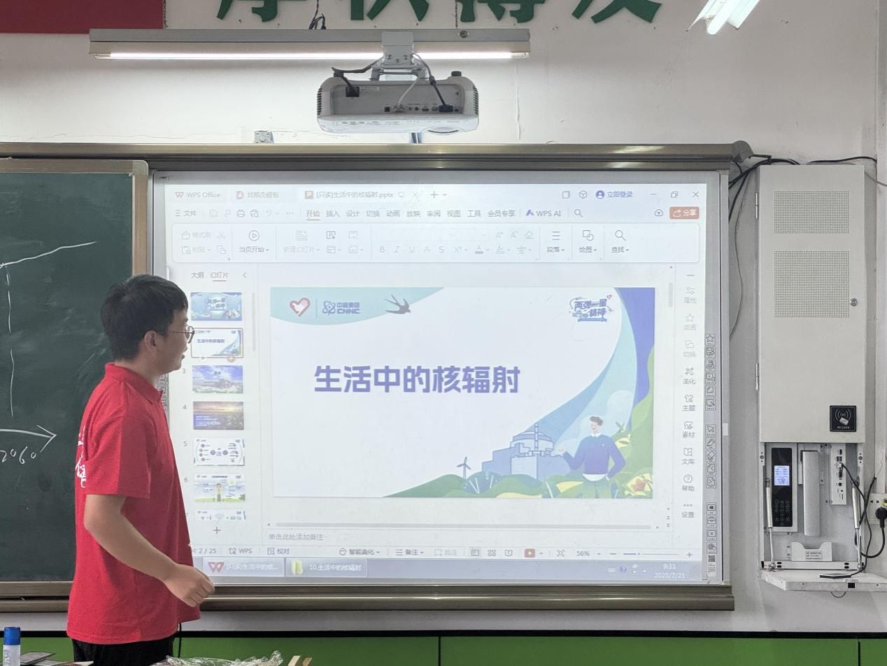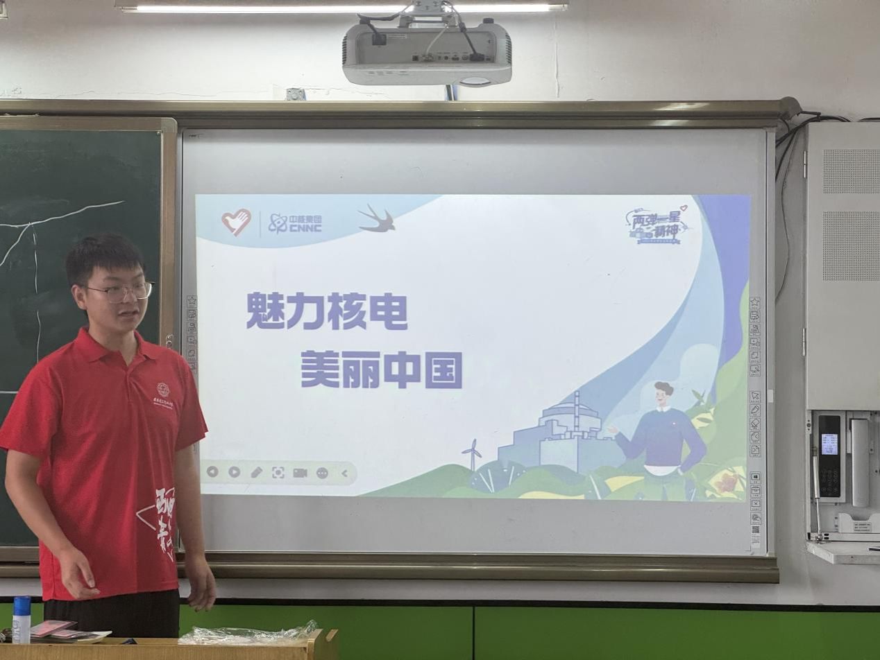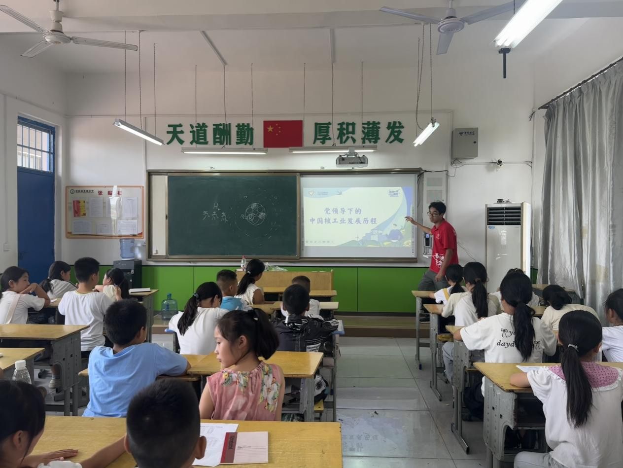 尹瑶琪同学以《核电赋能美丽中国》为主题,结合我国“碳中和”、“碳达峰”的“双碳”目标,分析了核能在优化能源结构、推动绿色低碳发展中的重要意义,展现了核技术助力生态文明建设的广阔前景。尹摇旗还用通俗易懂的语言为小员工们讲解核辐射的分类、日常防范措施以及其在医疗、农业等领域的应用,帮助孩子们消除对辐射的恐惧,树立科学认知。