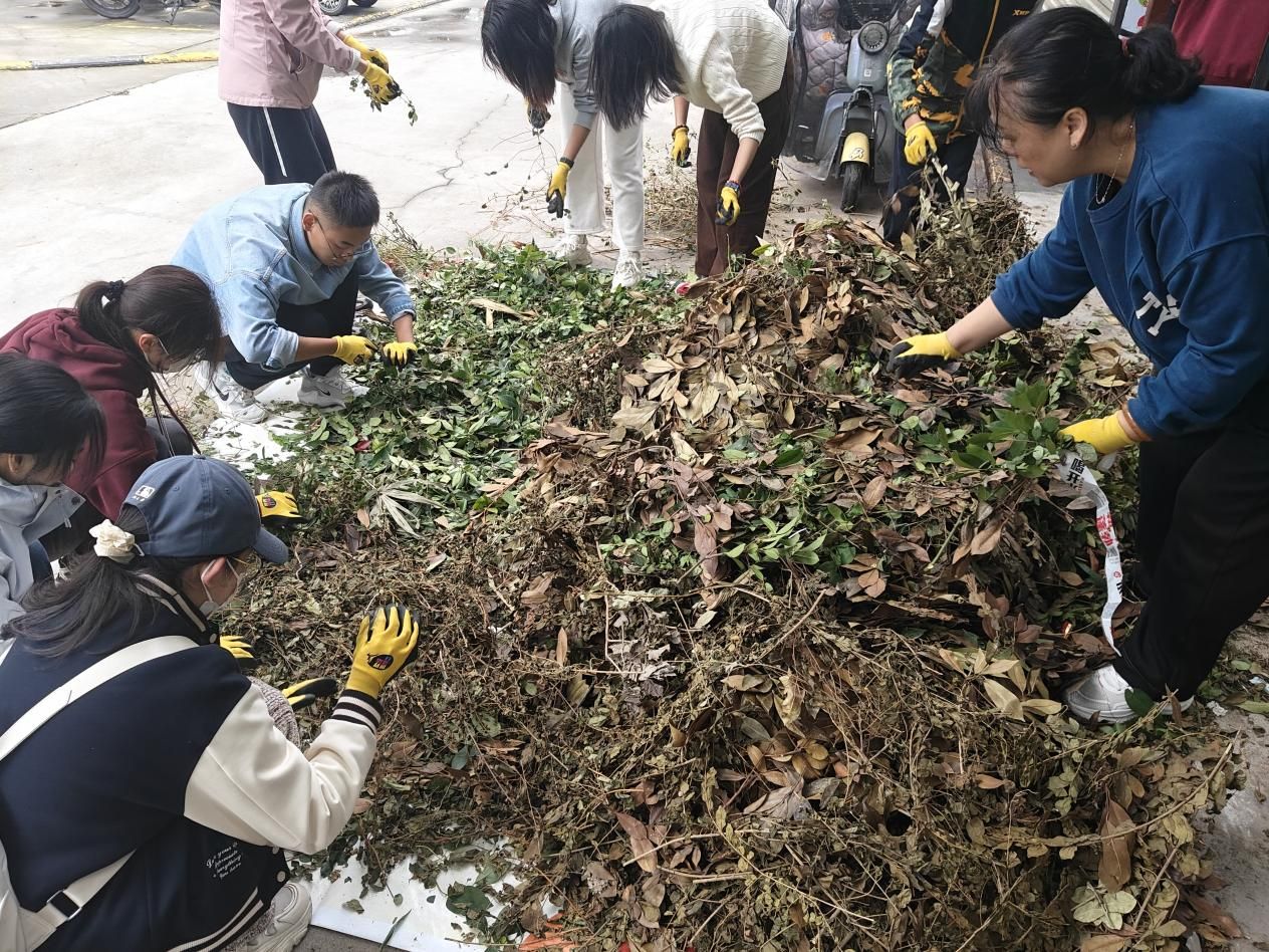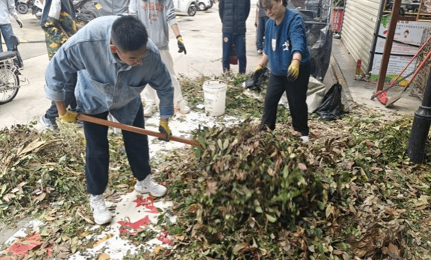活动当天,志愿者们早早抵达社区指定区域,迅速分工、高效协作,围绕“落叶分类处理”与“堆肥箱美化升级”两大任务展开行动。第一小组聚焦“落叶精细化处理”,手持铁锹、扫帚等工具,对社区内积存的大量落叶进行细致分拣。他们将粗硬的树枝与细碎的树叶逐一分类,树枝统一归集用于后续资源化利用,树叶则作为优质堆肥原料妥善储存。尽管落叶沾满泥土、作业环境较为脏乱,但志愿者们始终耐心细致,用实际行动保障堆肥原料的纯净度,为后续堆肥发酵打下坚实基础。