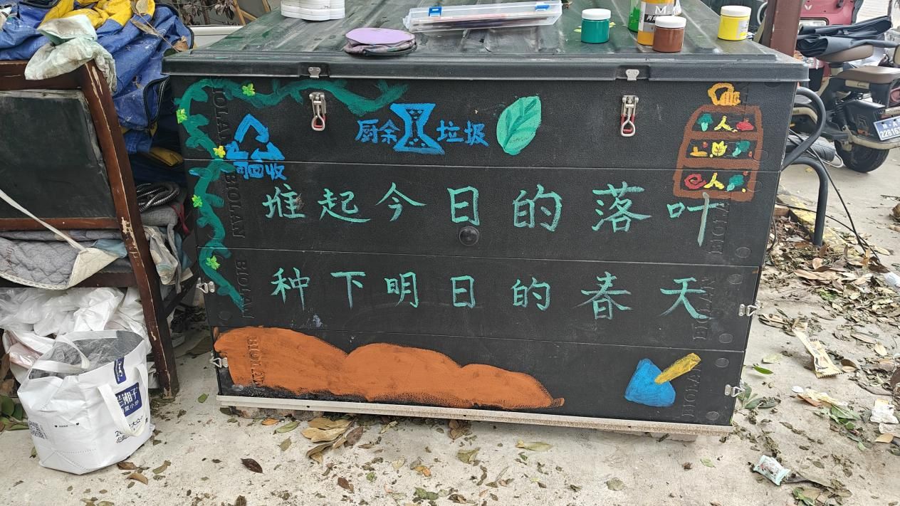 第二小组则投身于“堆肥箱整理与美化”工作。在清洗旧堆肥箱后,成员们拿起画笔与环保颜料,在箱体外侧精心绘制环保主题彩绘。正面以明黄色醒目书写“落叶归田,低碳有我”,搭配绿色回收标志与堆肥流程图示,直观传递资源循环理念;侧面则绘有“捡起今日的落叶,种下明日的春天”等暖心标语,辅以树叶、土壤、嫩芽等自然元素,使原本朴素的堆肥箱焕然一新,成为社区内一道兼具功能与美感的“环保艺术打卡点”。