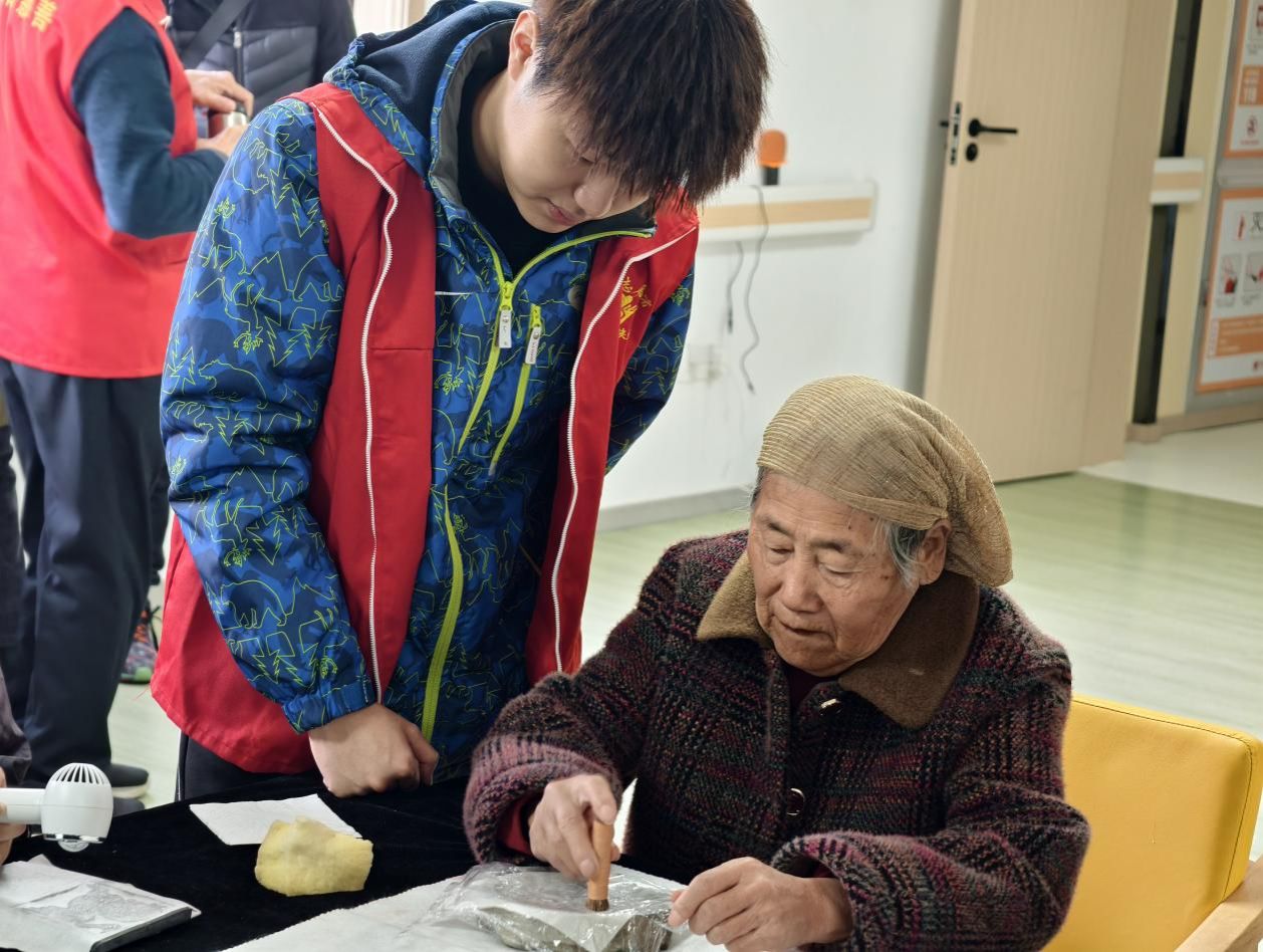袁岳同学:“这次去敬老院的经历,让我感触很多的。我们为爷爷奶奶唱歌,他们开心地跟着打拍子;一起做拓印,手把手印出美丽的图案。最让我意外的,是爷爷奶奶们也准备了节目,他们的歌声里满是故事。我忽然明白,陪伴不是我们单方面的‘给予’,而是一次温暖的对话。我们带去热闹,他们回赠我们历经岁月的从容。这次志愿活动令我动容。”