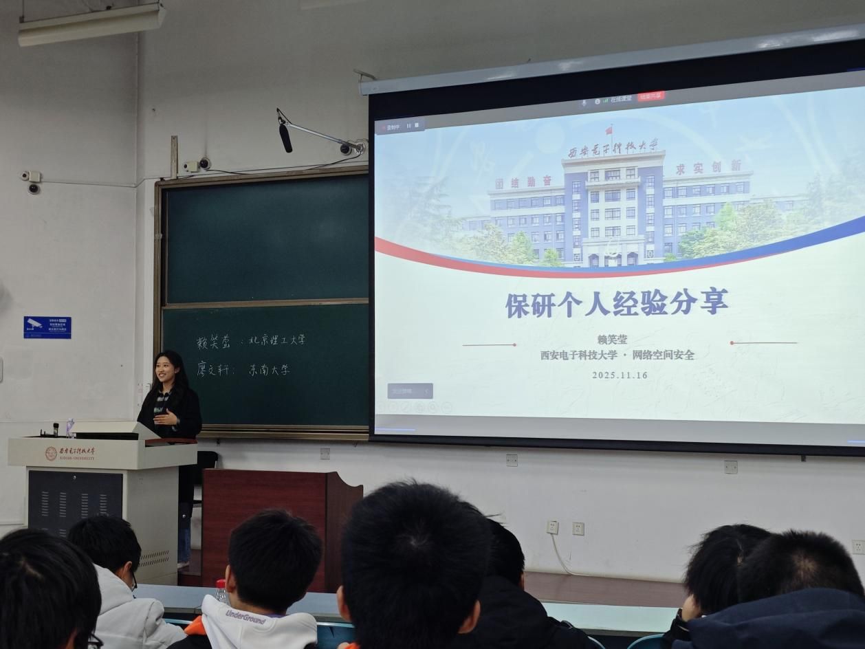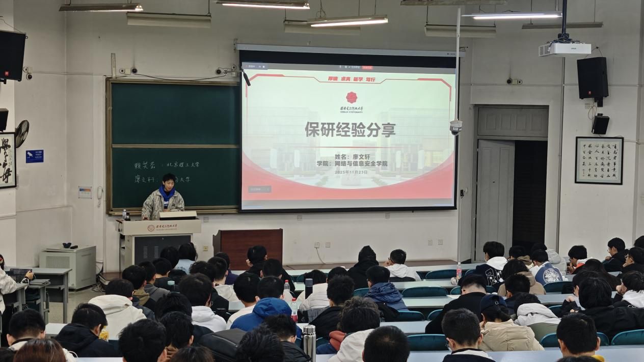 11月23日晚,赖笑莹同学结合其保送北京理工大学的经历,重点强调了参与科研项目的重要性,并深入说明该如何参与高质量、有深度的科研实践。她系统梳理了保研全流程的关键时间节点——从大二阶段稳扎稳打提升绩点、积累项目经验,到大三下学期集中精力准备夏令营与预推免,为同学们提供了清晰可行的时间规划参考。廖文轩同学则介绍了其被东南大学录取的经验。他强调,扎实的科研与竞赛经历是其申请过程中的核心支撑,他建议同学们夯实专业课基础,深入理解所参与项目的每一个细节,“任何环节都可能成为面试追问的重点”。