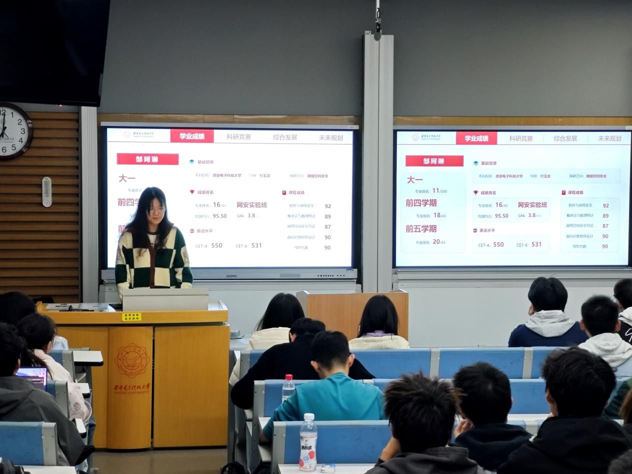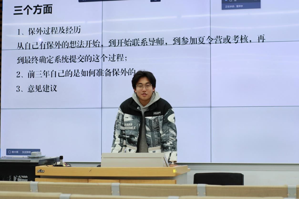 11月9日晚,王一然、邹珂琳两位同学作为主讲嘉宾,分享了自己保送本校的经验。王一然从本科一年级的学习规划谈起,建议同学们自入学伊始即高度重视必修课程学习,尤其要夯实专业核心课程基础。此外,她还分享了自身参与学科竞赛和科研实践经历。邹珂琳同样强调了专业课程成绩在保研过程中的关键作用,并鼓励在场同学:即便大一阶段学业表现未达预期,只要从大二起奋起直追、稳扎稳打,依然有机会实现逆袭。