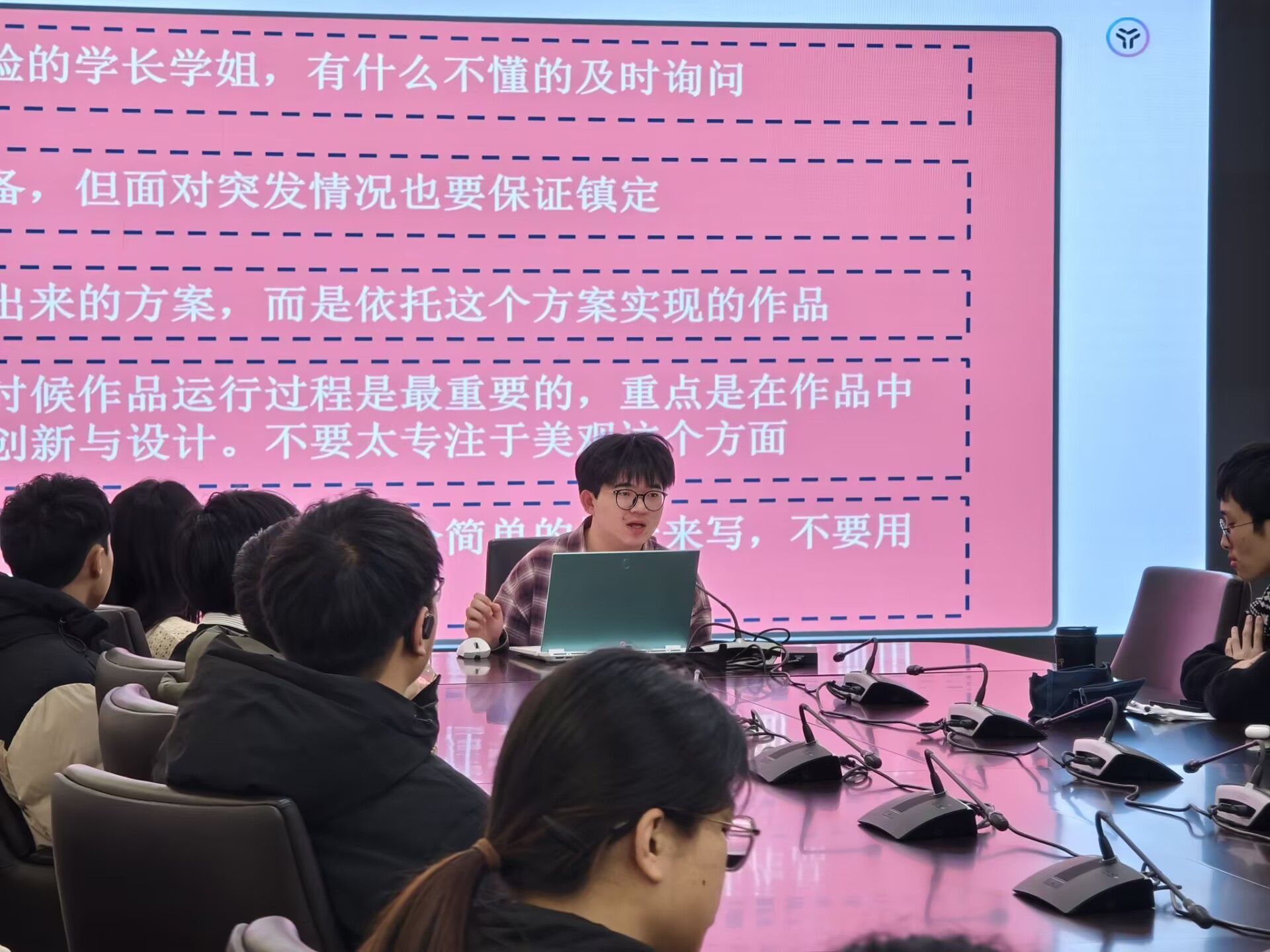 最后,两位学长分享自己参赛的感悟,他们建议学弟学妹不要以功利心参与比赛,比赛的意义不在于最终是否获奖,而在于备赛过程中积累的经验、建立的团队信任以及对专业知识的深入理解。