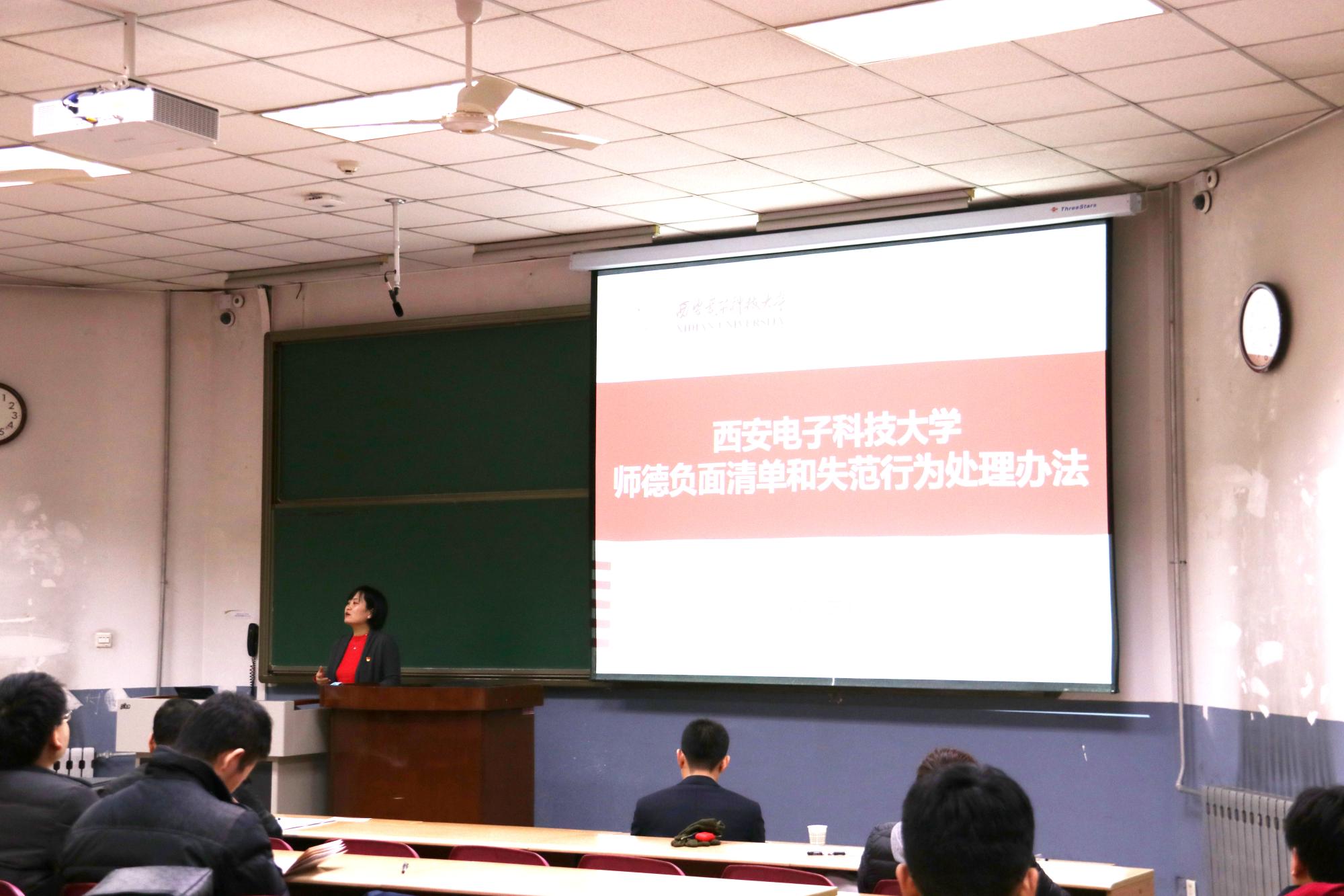 之后,张美茹对西电师德规范三十条、西电师德负面清单和失范行为处理办法进行了详细解读,对在思想政治方面、公司产品方面、学术道德方面和工作生活方面存在的师德师风失范典型案例,一一分析警示,强调对存在师德师风失范行为的教职工一律实行“一票否决”。