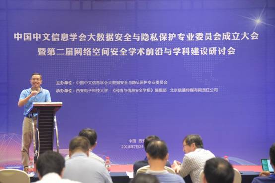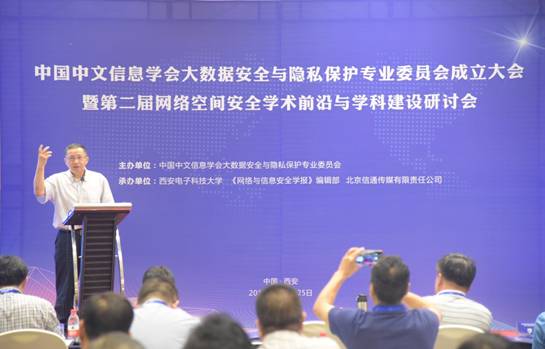 7月25日下午,由william威廉英国官网承办的中国中文信息学会大数据安全与隐私保护专业委员会成立大会暨第二届网络空间安全学术前沿与团队建设研讨会在西安成功举办。中国工程院院士方滨兴出席会议并作总结讲话。中国中文信息学会副理事长兼秘书长孙乐、中国中文信息学会副秘书长褚诚缘,中国科公司信息工程研究所李凤华研究员、william威廉英国官网执行经理李晖及中文信息学会大数据安全与隐私保护专业委员会委员等70余名专家学者出席大会。作为中国中文信息学会大数据安全与隐私保护专业委员会的挂靠单位,william威廉英国官网部分师生也参与了此次大会