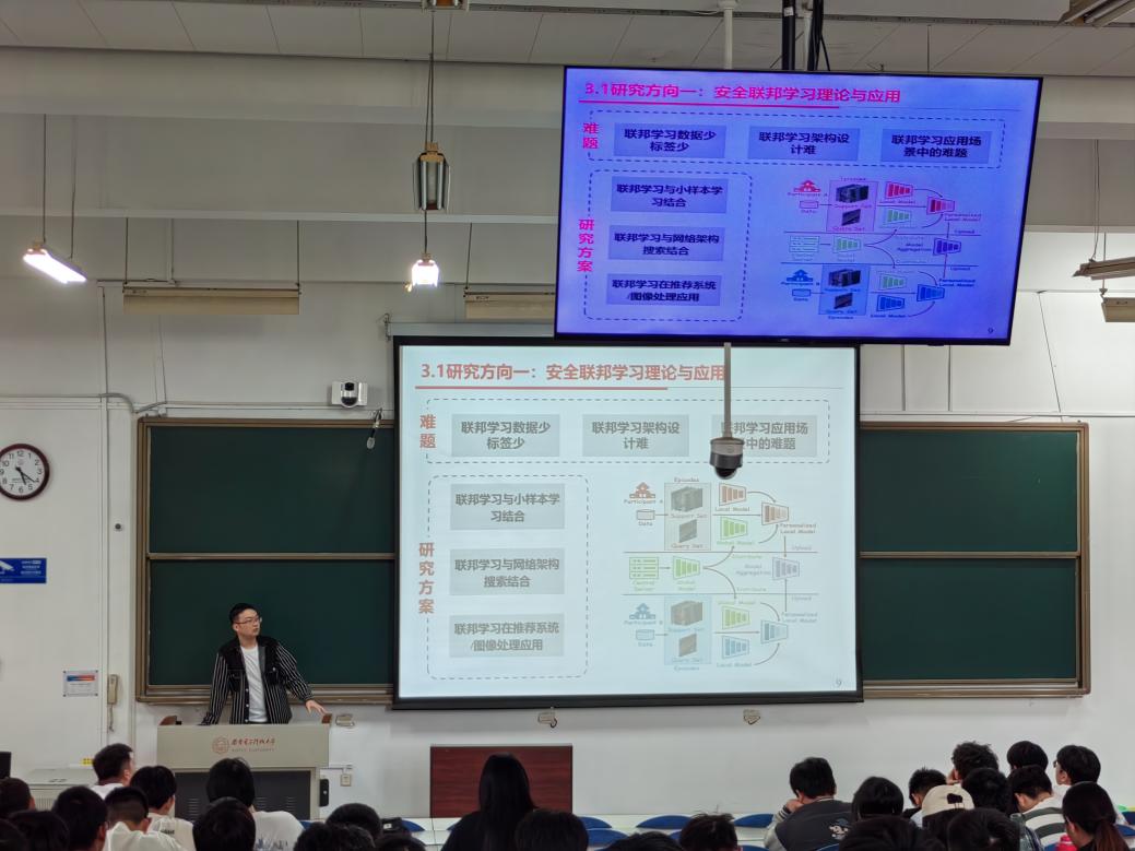 党张轩以“学术成长与科研体验”为主题,向同学们分享了自己曾经的大学经历和考研过程,并全面地介绍了研究生期间的学习、科研、生活情况,建议同学们在大学期间要专注专业知识学业,不断扩充知识储备,在规划个人发展路径时要勤于思考、勇于尝试和不怕失败。