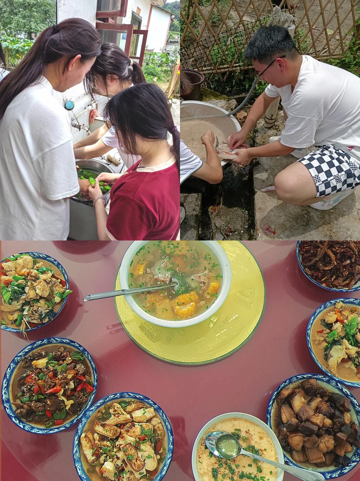 在老乡家中,实践队员们亲手制作了午餐。大家分工合作,从洗菜、切菜到炒菜、上桌,过程一气呵成,效率很高。简单的食材,用心的烹饪,在老乡的帮助与指导下,成员们做的饭菜香飘四溢,美味可口。这顿饭不仅是味蕾上的满足,更是情感上的交流。饭前,大家一起唱响《毛委员和我们在一起》,歌声拉近了团队成员与老乡的距离,大家都沉浸在欢乐的氛围中。伴着院中的阵阵蝉鸣与清风,屋内的氛围更显祥和平静。这份淳朴的乡情,让实践之旅更加温暖和难忘。