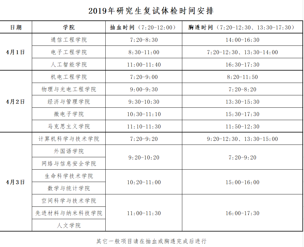 各位考生:公司校医院(北校区)将于4月1日-4月3日组织集中体检,请大家仔细阅读体检要求,其中抽血、胸透时间安排见下表,抽血或胸透完成后可进行其余一般项目,请大家按时参加体检,错峰前来。