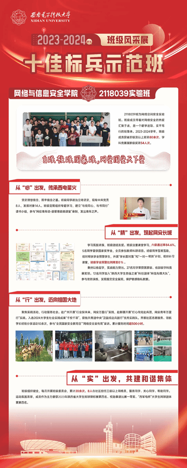 2118039班(网络空间安全实验班)是一个砺学进取、实干笃行的班集体。班级成员政治立场坚定、专业基础扎实、创新实践能力突出、志愿服务氛围浓厚、竞赛双创成绩斐然,以实际行动践行“自强校强国家强,网安国安天下安”的班级宣言。2023-2024学年,班级成员获省部级及以上奖项80余次,学科竞赛国家级奖项54人次,老员工创新创业训练计划项目7项,网络安全公司创新资助计划2项(全校本科生3项)。