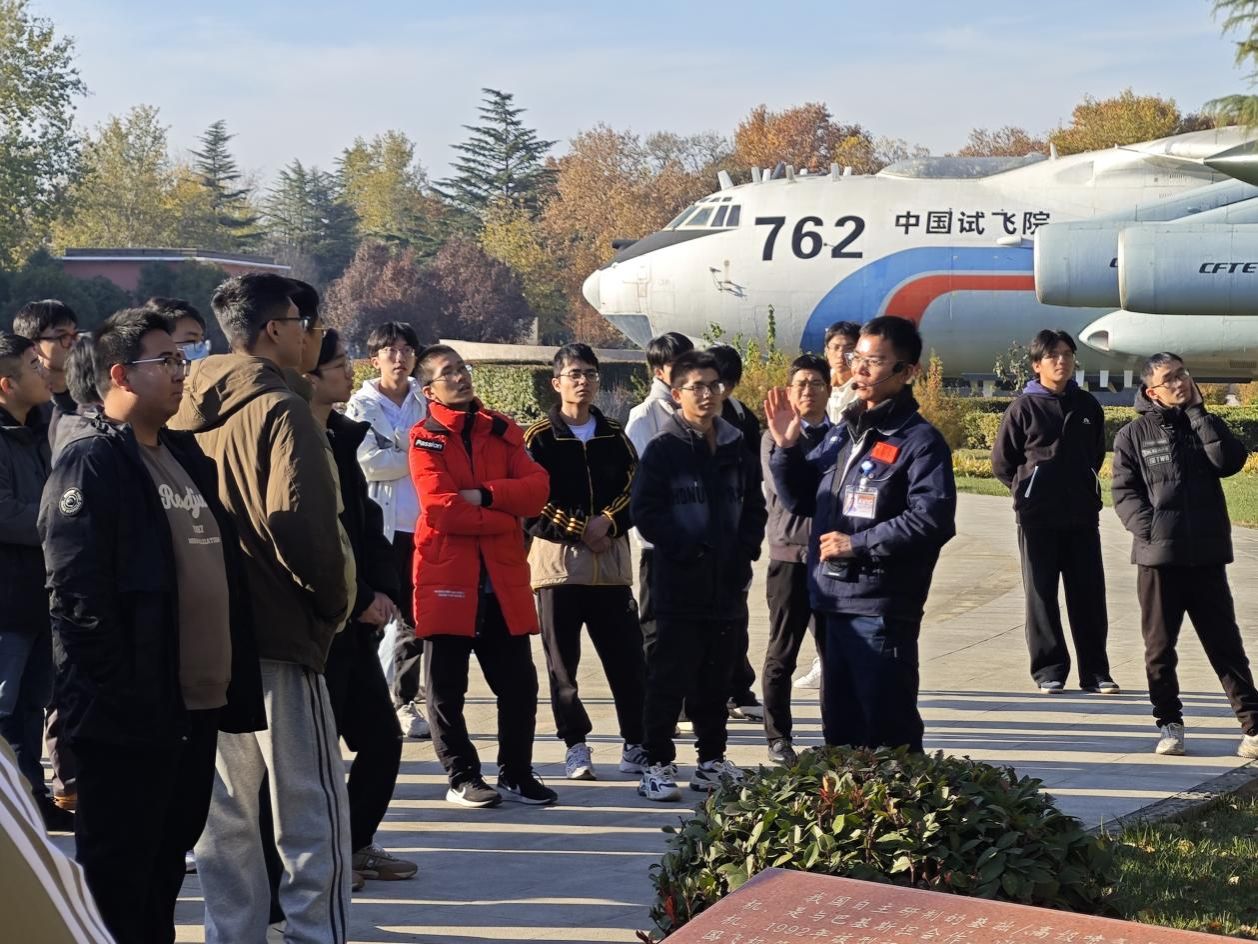 活动伊始,中国飞行试验研究院人力资源部副部长刘文佳对西电师生的到来表示热烈欢迎,他向师生们简单介绍了试飞院的发展历程和基本情况。接下来,师生们跟随着讲解员的脚步参观了功勋飞机园。讲解员从飞机整体构成,研发技术迭代以及艰辛的试飞历史等方面,详细介绍了歼五、初教六、轰六、运七、空警2000预警机等一系列见证我国航空事业腾飞的功勋飞机。在这里,一架架钢铁雄鹰静静地诉说着我国航空工作者从逆向研发到自主研发的艰难岁月,试飞英雄搏击长空的辉煌历史。在功勋飞机园,脚下的每一步皆是历史,吹过的每一阵风皆是岁月。在功勋园的最里面竖立了几块红色的功勋墙,上面镌刻着为中国航空事业燃烧过岁月的先辈的名字。昂首望去,师生们心生敬意,共同感受着几代试飞人薪火相传、砥砺前行的精神力量。